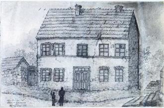Loewes Geburtshaus in Löbejün. Bleistiftzeichnung seiner Tochter Julie von Bothwell, die diese erst nach seinem Tod zu Papier gebracht hat.