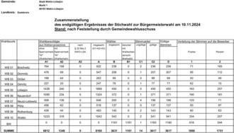Gemäß § 37 KWG-LSA hat der Gemeindewahlausschuss in seiner Sitzung am 12.11.2024 das endgültige Wahlergebnis der am 10.11.2024 erfolgten Stichwahl zur Wahl der hauptamtlichen Bürgermeisterin/ des hauptamtlichen Bürgermeisters der Stadt Wettin-Löbejün festgestellt.