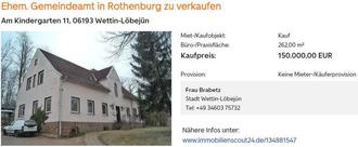 Das vollständige Exposé ist entweder online auf www.immobilienscout24.de/134881547 oder auf der Internetseite der Stadt Wettin-Löbejün auf www.stadt-wettin-loebejuen.de unter „Wirtschaft“ - „Grundstücksveräußerungen“ einsehbar.