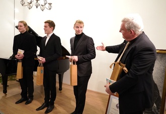 Tom Nicholson (Bariton), Simon Zeppenfeld (Bass) und Markus Auerbach (Bariton) trugen jugendlich frisch und zugleich auf bemerkenswert hohem Niveau ihr gut ausgewähltes Programm vor. Meisterhaft begleitet wurden sie auf dem Klavier von Prof. Heiko Reintzsch (im Bild v. l. n. r.).