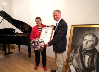 In der Mitte des Konzerts hielt Musikwissenschaftlerin Dr. Karin Zauft eine Laudatio auf Dr. Heidelore Rathgen, die scheidende Schatzmeisterin der ICLG. Darin betonte sie unter anderem: „Heidi Rathgen ist die sprichwörtliche Seele des gesamten Carl-Loewe-Zentrums, und mehr noch: Sie war und ist dessen Rückgrat, das alles trägt und zusammenhält. Sie knüpft die Verbindungen, konzipiert Projekte, organisiert Gelder, aktiviert namhafte Gäste, sie stützt und reguliert das gesamte Gefüge; und es würde ihr gut anstehen, virtuos zu singen: ‚Ich bin das Faktotum der Carl-Loewe-Welt.‘“ Eine schöne und treffende Würdigung für die 80-jährige Jubilarin.