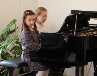 Carl Loewe ist zum Glück nicht nur Vergangenheit, sondern auch Gegenwart und Zukunft! Das hat sich einmal mehr im Konzert der Kreismusikschule „Carl Loewe“ gezeigt, das am 22. April im Carl-Loewe-Haus unter Leitung von Ilka Grießer zu erleben war. Zwölf Schülerinnen und Schüler und drei Lehrerinnen brachten ausschließlich Kompositionen des großen Sohnes Löbejüns im vollbesetzten Kammermusiksaal zu Gehör. Die jüngsten Musikerinnen waren Valerie Werneyer (im Bild vorn) und Laura Willner. Sie spielten die Lieder „Die Quelle“ und „Die Schule“ in einer Bearbeitung von Ute Nowak vierhändig auf dem Klavier (Foto: Bendix Maeder).