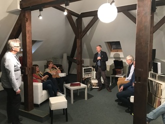 Einen Tag nach dem Konzert besuchte eine Gruppe aus ganz Deutschland das Carl-Loewe-Museum. Die Besucherinnen und Besucher kamen aus dem hohen Norden über Münster und Mainz bis nach Nürnberg, um mehr über Carl Loewe, seine Löbejüner Wiege, seinen Lebensweg und sein Schaffen zu erfahren. Andreas Porsche führte sie in gewohnt engagierter Weise durch das Carl-Loewe-Haus und beeindruckte die Gäste mit seinem umfangreichen und detailreichen Wissen. In der Tonträgersammlung im Dachgeschoss gab es eine Hörprobe von einer Schelllackplatte (s. Foto). Frieder Badstübner beendete die Führung in der Stadtkirche St. Petri und spielte zum Abschluss noch drei kleine Loewe-Kompositionen auf der restaurierten Rühlmann-Orgel.