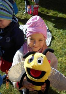Unsere Polly wurde direkt von einigen Kindern wiedererkannt, da sie uns letztes Jahr schon bei unserem Bienenprojekt begleitet hat.