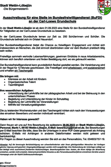 In der Stadt Wettin-Löbejün ist ab dem 01.09.2023 eine Stelle für den Bundesfreiwilligendienst für Tätigkeiten an der Carl-Loewe Grundschule zu besetzen.