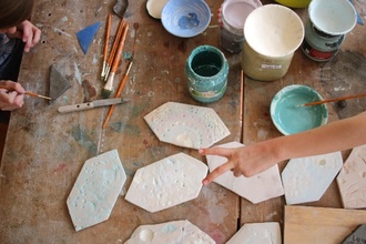 Dabei wurden gleichmäßige Fliesen aus Platten geschnitten die über mehrere Kunststunden dekoriert wurden.