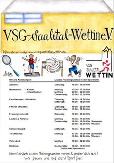 Die VSG „Saaletal“ Wettin gibt es nun schon seit 40 Jahren. Hier trainieren Freizeitsportler:innen gemeinsam, um fit und gesund zu bleiben, den Alltagsstress hinter sich zu lassen und soziale Kontakte zu pflegen. Nach den Sommerferien gibt es eine neue Minikids-Sportgruppe sowie eine Abteilung Tischtennis, die für jedes Alter geeignet ist. Schaut euch die Trainingszeiten an, kommt vorbei und probiert euch aus. Sport frei!