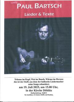 Seit mehr als zwanzig Jahren bemüht sich der Förderverein Kultur und Geschichte Döblitz e.V. um die Sanierung und kulturelle Nutzung der im frühen 12. Jahrhundert erbauten spätromanischen Dorfkirche. Der hallesche Liedermacher Paul Bartsch unterstützt das Engagement des Vereins auch in diesem Jahr durch ein Konzert, bei dem er sein 2024 erschienenes Buch "... und das ist noch nicht alles" musikalisch vorstellt.