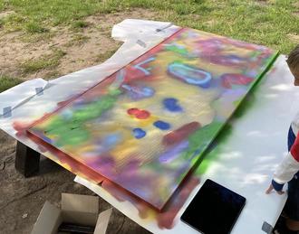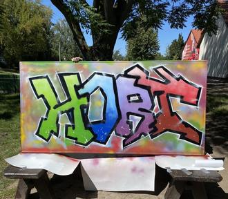 Zusammen mit Herrn Gleicher und Herrn Andrae haben die Hortkinder in den Sommerferien ein Graffiti-Projekt durchgeführt. Unter der Führung der Fachkräfte konnten die Kinder eine ausrangierte Schultafel mit einer Deckfarbe bepinseln.