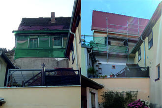 Nicht immer fallen Baufortschritte so ins Auge, wie bei der Erneuerung unseres Daches. Viele kleine Dinge oder versteckte Bereiche nehmen aber ebenfalls Zeit, Arbeit und pekuniäre Aufwendungen in Anspruch. Wer alte Häuser restauriert, weiß sicherlich sehr gut, wovon ich rede ... Zu den versteckten Bereichen der Brauhausgasse gehört u.a. die nördliche Fassade der oberen Etage. Einsehbar ist sie eigentlich nur von den beiden unmittelbaren Nachbargrundstücken und aus der Ferne von einigen Vorstadtbewohnern auf dem Rosen- und dem Sperlingsberg. Schon vor Jahrzehnten vom geplagten Nachbarn notgesichert, gammelte die Fassade weiter vor sich hin und drohte auch beim zweiten Bauabschnitt aus dem engen finanziellen Rahmen herauszufallen. Dass es doch noch anders kam, ist unserem Vereinsfreund Jan Zametschnik zu verdanken, der sich die Fassade kurzerhand vornahm. Der lose Putz samt älteren Sicherungsmaterialien wurde entfernt. Es folgten Flickarbeiten an der teils beschädigten bzw. nicht mehr vorhandenen Ausfachung, dann wurde ein denkmalgerechter Putzträger aufgebracht und schließlich hat der Walter das ganze neu verputzt und am Ende auch noch schön angestrichen – natürlich mit Silikatfarbe, alles schön diffusionsoffen, wie es ein Fachwerk braucht!