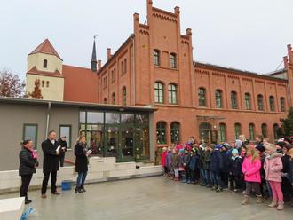Das imposante Backsteingebäude der Grundschule blickt ebenfalls auf die Geschehnisse.