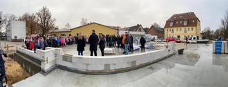 Steffi Syska bedankte sich bei der Grundsteinlegung bei allen Beteiligten, ermunterte alle anwesenden Kinder gleichzeitig zu antworten und freute sich, dass das Vorhaben nun endlich sichtbare Formen annimmt. Gemeinsam mit dem Stadtratsvorsitzenden Mario Schulze, der Vorsitzenden des Sozialausschusses des Stadtrates Annett Beyer, der Schulleiterin Kathrin Bittl und einem Schulmädchen verschlossen sie die von den Schulkindern gefüllte Zeitkapsel und versenkte sie in den neuen Gebäudemauern bevor sie anschließend verschlossen wurde. Darin befindet sich übrigens auch ein Coronatest, ein prägender Zeitbegleiter der letzten beiden Jahre.