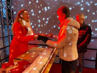 Mit einem Stück Riesenstollen und einem Heißgetränk bedankte sich Bürgermeisterin Steffi Syska bei den anwesenden Sponsoren.