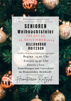 Der Roitzscher Heimatverein e.V. lädt alle Roitzscher Seniorinnen und Senioren zu einem gemütlichen Nachmittag in vorweihnachtlicher Atmosphäre am Dienstag, den 26.11.2024, ab 15.00 Uhr in die Billardbar in Roitzsch ein.