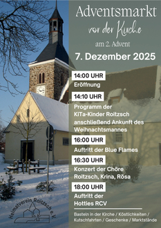 Am 2. Advent, Sonntag, den 7. Dezember 2025, laden wir euch herzlich ein, mit uns die Adventszeit zu feiern! Vor der Kirche in Roitzsch erwartet euch ein stimmungsvoller Adventsmarkt mit viel Musik, Spaß und weihnachtlichem Flair. Freut euch auf ein großartiges Kulturprogramm mit der KiTa Roitzsch, den Blue Flames vom SV Roitzsch, den Hotties vom RCV Roitzsch und einem festlichen Kirchenkonzert mit den Chören aus Roitzsch, Krina und Rösa.