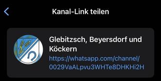 im Zeitalter sozialer Medien und ständiger Smartphone-Nutzung, entstand die Idee, interessante Informationen über Veranstaltungen in unseren drei Ortschaften und im weiteren Stadtgebiet für unsere Einwohner nicht nur in den vorhandenen Schaukästen auszuhängen oder im Lindenstein zu veröffentlichen, sondern auch in den sozialen Medien und diversen Nachrichtendiensten zu teilen. Aus diesem Grund wurde der WhatsApp Kanal „Glebitzsch, Beyersdorf und Köckern“ erstellt. Hier werden wochenweise aktuelle Veranstaltungen und sonstige relevante Information aus unseren drei Ortschaften und dem Stadtgebiet für alle Abonnenten zugänglich gemacht. Der Kanal ist kostenfrei und kann von jedem abonniert werden. So bleibt ihr immer auf dem Laufenden.