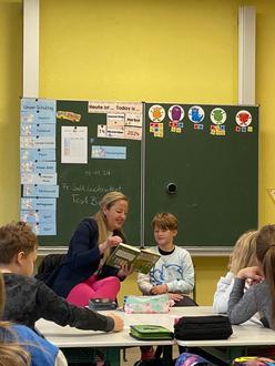 Nach mitgebrachten Plätzchen und einer kleinen Gesprächsrunde beteiligten sich die Schülerinnen und Schüler selbst aktiv am Vorlesen und trugen kleine Passagen des Buches vor. Es war ein interaktiver und fröhlicher Austausch, der die Freude am Lesen und an Geschichten weckte.