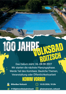 Im Jahr 2027 feiert das Volksbad Roitzsch sein 100-jähriges Bestehen. Das Jubiläum soll vom 6. bis 8. August 2027 mit einem Festwochenende begangen werden. Zur Vorbereitung startet nun die nächste Planungsphase. Der Heimatverein Roitzsch ruft interessierte Bürgerinnen und Bürger dazu auf, sich aktiv an der Organisation zu beteiligen. Gesucht werden Unterstützerinnen und Unterstützer für die Bereiche: bauliche Themen, Veranstaltungsplanung sowie Öffentlichkeitsarbeit.