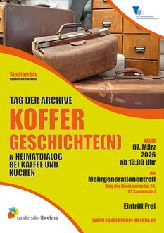 Am 7. März 2026 lädt das Stadtarchiv Sandersdorf-Brehna alle Interessierten ein, wieder mal einen Blick auf die Geschichte ihrer Stadt zu werfen. Zum diesjährigen bundesweiten Tag der Archive steht ein ganz besonderes Projekt im Mittelpunkt: „Geschichte und Geschichten aus dem Koffer“.