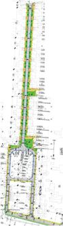 Gestaltungsvariante: Die Verkehrsplanung sieht eine Reduzierung der Fahrbahnbreite auf 5,50 m vor, was einen Begegnungsfall LKW/PKW gewährleistet. Die gewonnenen Flächen werden als Grünbereiche genutzt. Die Gehwege erhalten eine Breite von 2 m, um große Pflanzflächen zu ermöglichen. Die Sichtachse zur zentralen Grünanlage bleibt unverändert.