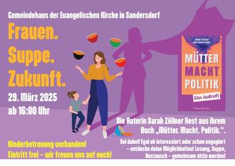 Wir laden euch herzlich ein, der Autorin Sarah Zöllner zu lauschen. Sie liest einen Auszug aus ihrem Buch „Mütter. Macht. Politik.“ Anschließend bietet ein gemeinsames Suppenessen Raum für Austausch und Diskussion. In entspannter Atmosphäre möchten wir insbesondere Frauen, die bisher noch nicht politisch aktiv sind, ermutigen, ihre Möglichkeiten zu entdecken.
