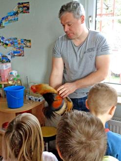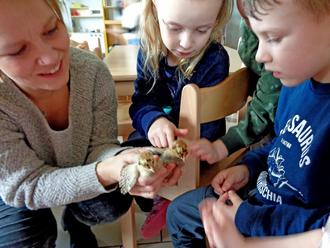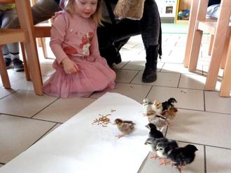 Die kleinen Gäste begrüßten uns mit einem lauten Gepiepe. Elf kleine Küken entdeckten wir in einer Kiste. Munter konnten sie durch die Gruppenzimmer laufen. Die Kinder durften sie streicheln, denn sie hatten einen schönen weichen Federflaum. Sie hatten Würmer mit, damit die Kinder sie füttern und beobachten konnten. In einer weiteren Kiste waren ein Hahn und eine Glucke, die der Papa von Elina den Kindern zeigte.