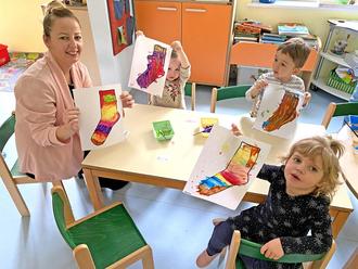 Bürgermeisterin Steffi Syska malt mit den Kleinsten in der Kita Max und Moritz bunte Socken.