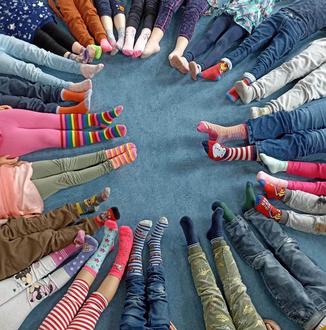 Von den kleinen Füßen mit den bunten Socken der Kita Villa Kunterbunt wird einem auch ganz schwindelig.