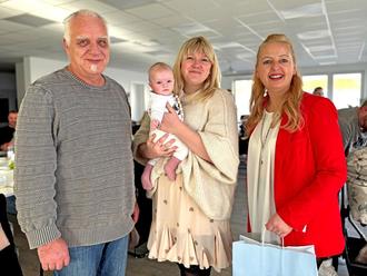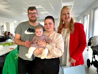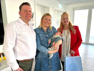 Pia-Sophie Dittmann mit ihrem Engelchen Alea und Ortsbürgermeister Mario Willer. Auch Papa Jeremy Grothe ist stolz auf sein kleines Mädchen.