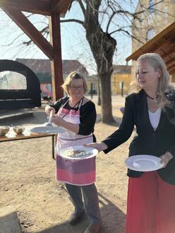 Vielen Dank für die Arbeitskraft und das Bereitstellen von Gerätschaften. Ein weiterer Dank geht an den ehemaligen ortsansässigen Bäcker Hayo Zschieschang und Zimmermeister Martin Möbius, die nicht nur bei Minusgraden den Ofen fachgerecht über mehrere Tage hochgeheizt haben, sondern auch wichtige Hinweise zum Betreiben des Ofens und zum Backhandwerk weitergaben. Mit diesem Wissen hat unsere Schulleiterin Frau Wolff mit Akribie und Fleiß die kulinarische Versorgung am sonnigen Donnerstag sichergestellt. Danke.