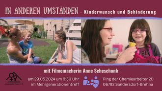Das Frauenzentrum Wolfen vom Verein „Frauen helfen Frauen“ und der Mehrgenerationentreff Sandersdorf-Brehna laden Interessierte recht herzlich zu einer Veranstaltung mit der Filmemacherin Anne Scheschonk anlässlich des Europäischen Protesttages zur Gleichstellung von Menschen mit Behinderungen