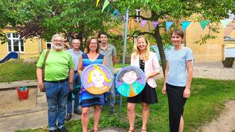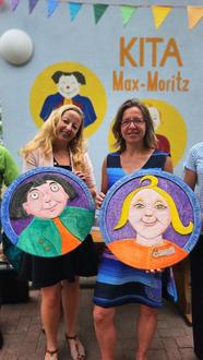 Der symbolische Start der Baumaßnahme wurde am 30.06.2023 vollgezogen. Feierlich übergab die Bürgermeisterin der Stadt Sandersdorf-Brehna, Steffi Syska, der Leiterin der Kindertagesstätte, Sandra Helmecke, Schnitzkunstobjekte mit den Motiven des „Max“ und „Moritz“, Figuren aus den berühmten Geschichten von Wilhelm Busch, die der Einrichtung damals ihren Namen gaben. Die kunstvoll gestalteten Baumscheiben wurden von Jürgen Spottke, einem Schnitzkünstler aus Wilthen, angefertigt und dienen nun als dekoratives Aushängeschild der Einrichtung.