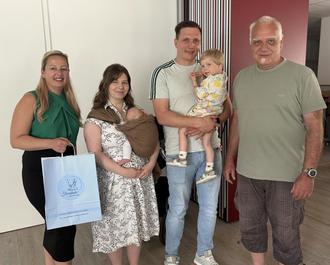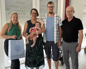 Fritz ist da! Gemeinsam mit Mama Katalin, Papa Steve und Bruder Karl empfängt er die Glückwünsche von Bürgermeisterin Steffi Syska und Ortsbürgermeister Mario Willer.