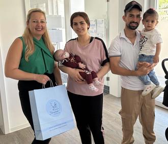 Issa und Ali freuen sich mit ihren Töchtern Jasmin und der kleinen Celine über ihr Familienglück. Bürgermeisterin Steffi Syska überbrachte herzliche Glückwünsche.