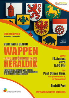 Im Zuge der Neugestaltung des Stadtwappens von Sandersdorf-Brehna bietet dieser Vortrag eine wertvolle Einführung in die Grundlagen der Heraldik. Die vermittelten Inhalte können eine wichtige Hilfe für die öffentliche Meinungsbildung sein. Wer fundiert mitreden möchte oder Impulse zur persönlichen Entscheidungsfindung benötigt, erhält hier das notwendige Rüstzeug.