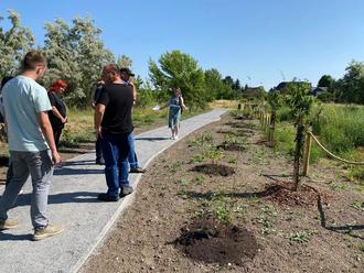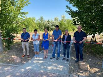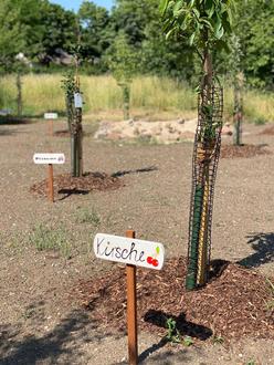 Bei der Begehung am 12. Juni waren die meisten Akteure der Umsetzung mit dabei: Doreen Henckens, die das Projekt von Doreen Scheffler übernommen hat und als Koordinatorin und Organisatorin wirkte. Weiterhin die Umsetzer: Thomas Kindler von der Baumschule Brehna. Er arbeitete eng mit Uwe Dirks und Ronny Schatz aus der Bauverwaltung hinsichtlich Bäume und Sträucher zusammen. Marlies Helmbach und zwei Teilnehmerinnen einer Maßnahme des Instituts für Bildungsmanagement und Potenzialentwicklung aus Dessau-Roßlau waren ebenfalls da. Sie und viele andere haben die Schilder für ebendiese Bäume und Sträucher erstellt. Patrick Kluge von FBB Galabau und René Gohl von der Bau-Service Union waren beim Bau des Weges engagiert. Natürlich war auch die Mit-Initiatorin des Projekts, Sabine Sperlich-Westenberger mit vor Ort. Sie hat noch viele weitere Ideen, wie alles noch mehr wachsen kann.