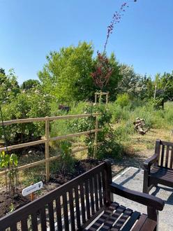 Ein Ort zum Verweilen mit Blutpflaume als baldigen Schattenspender.