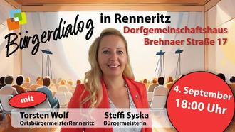 wir laden Sie herzlich zum offenen Bürgerdialog der Ortschaft Renneritz am Donnerstag, 04.09.2025 um 18.00 Uhr in das Dorfgemeinschaftshaus Renneritz (Brehnaer Straße 17, 06792 Sandersdorf-Brehna) in Form eines „runden Tisches“ ein.