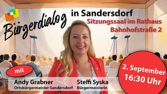 wir laden Sie herzlich zum offenen Bürgerdialog der Ortschaft Sandersdorf am Dienstag, 02.09.2025 um 16.30 Uhr in den Sitzungssaal des Rathauses der Stadt Sandersdorf-Brehna (Bahnhofstraße 2, 06792 Sandersdorf-Brehna) in Form eines „runden Tisches“ ein.