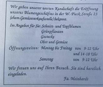 Zeitungsanzeige anlässlich der Eröffnung des Blumengeschäftes 1990 in der damaligen W.-Pieck-Straße 23