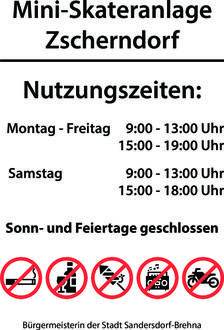 Die hier abgebildete Hinweistafel weist die Nutzungsbestimmungen auf und ist an der Mini-Skateranlage angebracht. Wir bitten eindringlich um die Beachtung und Einhaltung.