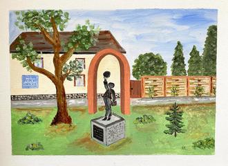 Das große Interesse an der Errichtung des Schnabel-Denkmals hat mich ebenfalls inspiriert. Daher habe ich das Denkmal auf Leinwand festgehalten. Schnabel ist als Knabe dargestellt, wie er aus dem Bogen hervortritt, ein Schulbuch aus den Franckeschen Stiftungen in der Hand. Mit der anderen Hand greift er nach der sich ihm eröffnenden Welt, symbolisiert durch eine Erdkugel.