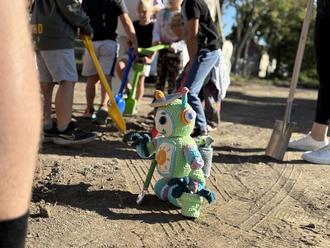 Das Masskottchen Zukki hat auch einen kleinen Spaten mitgebracht.