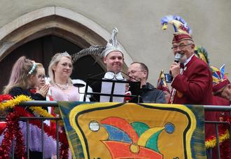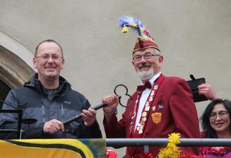 Nach dem der SKC Sangerhausen die Rathaustreppe praktisch schon besetzt hatte, blieb Oberbürgermeister (OB) Sven Strauß auch in diesem Jahr keine andere Wahl, als die Herrschaft und den Rathausschlüssel dem SKC-Präsident Günter Dienemann (B. r.) zu überlassen. Gut gelaunte Zuschauerinnen und Zuschauer warteten gespannt auf die eine oder andere Büttenrede, auf das neue Prinzenpaar und natürlich darauf, den Oberbürgermeister noch ein letztes Mal reden zu hören, bevor die Karnevalisten die "Herrschaft" über die Stadt übernehmen. Natürlich mit einem Augenzwinkern vorgetragen, und sich selbst auf die sprichwörtliche Schippe genommen, richtete der OB in seiner Büttenrede ein Dank an den SKC: "Zu den schönen Aufgaben eines OB zählt die Faschingseröffnung mit dem SKC. Drum an dieser Stelle Dank und Respekt dass ihr jedes Jahr aufs Neue zeigt was in euch steckt. Die Menschen benötigen seit ewigen Zeiten Humor und Frohsinn, die Sorgen zu vertreiben. Und dafür steht der SKC, dass weiß ich genau darauf ein kräftig Sangerhausen Helau". Erstmalig dabei war Rosenprinzessin Emily I., und natürlich auch der Karnevalspräsident vom befreundeten Riestedter Karnevalsverein (RKV).
