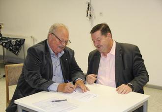 (Bild: Der ehemalige Oberbürgermeister und Vereinsvorsitzende Fritz-Dieter Kupfernagel und Torsten Schweiger unterzeichnen das Übergabeprotokoll)