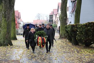 Im Mittelpunkt der Veranstaltung stand, als gemeinsame Geste des Respekts und des Erinnerns, die feierliche Kranzniederlegung durch den Oberbürgermeister Torsten Schweiger zusammen mit der Pressesprecherin des Landkreises, Michaela Heilek.