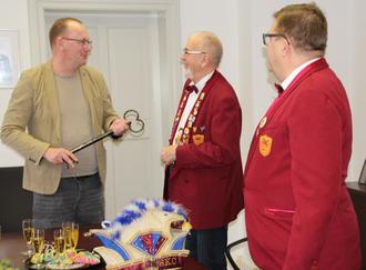 Die 5. Jahreszeit der Karnevalliebhaber ist Geschichte - Am Aschermittwoch, ging die Karnevalsession 2023/2024 zu Ende. Traditionsgemäß brachte der SKC Sangerhausen um 11.11 Uhr den Rathausschlüssel zurück. Den hat er sich nämlich am 11.11.2023 von Oberbürgermeister Sven Strauß (B. u. l.) geholt. Aber vorher hieß es: Kappen runter, Orden ab!