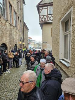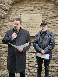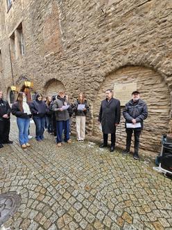 An der Gedenktafel am Historischen Rathaus fand eine würdevolle Gedenkveranstaltung statt, organisiert von Helmut Loth, dem Vorsitzenden des Vereins für Geschichte von Sangerhausen und Umgebung e. V. (rechts im Bild).