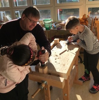 Seit langem sammelten die Kinder dafür verschiedene Materialien, wie hohle Pflanzenstängel, Äste, Blechbüchsen und Holzstücke. Auch die Eltern unterstützten uns dabei. Nun war es endlich so weit: Gemeinsam mit Herrn Seeber haben wir drei Tage lang gesägt, gebohrt, geschnitten, gesteckt und gepinselt. So entstanden über 30 Insektenhotels. Beim Hantieren mit Bohrer, Säge und Pinsel waren die Kinder neugierig und mutig, denn für viele von ihnen war es das erste Mal, dass sie mit einem Akkuschrauber, einer Laubsäge oder einer Gartenschere hantierten. So sammelten die Kinder neben dem Wissen über Insekten auch neue Erfahrungen im motorischen Bereich.