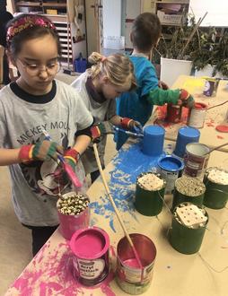 Anschließend hatten die Kinder ganz viel Spaß beim Anmalen ihrer Dosen. Ayla hat ihre Dose ganz besonders gestaltet: "Meine Dose ist gelb und schwarz, damit sie wie eine Biene aussieht."